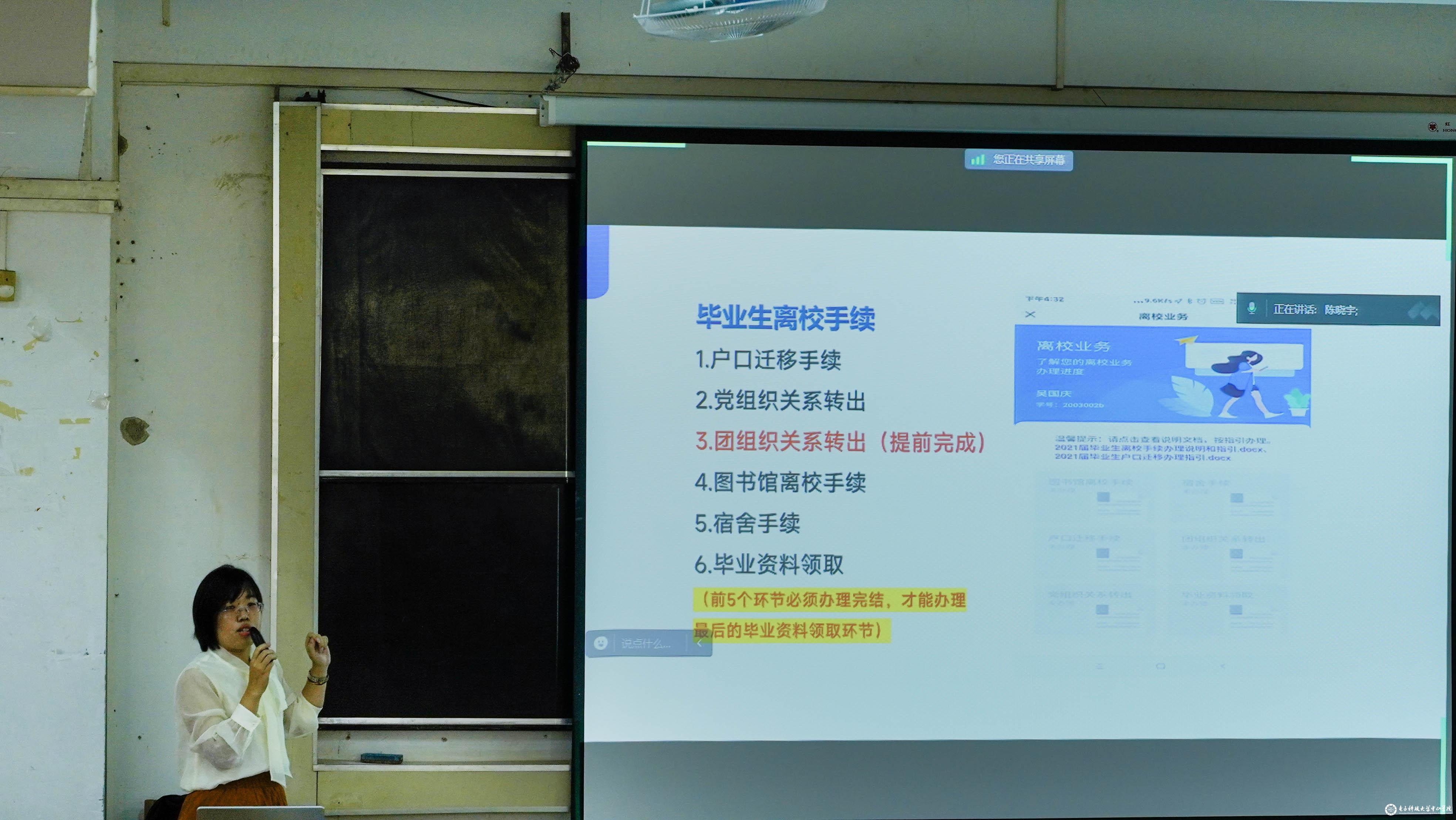 二、苗文双老师详细介绍毕业生离校手续。毕业生离校手续共6个环节,其中党团组织关系转出为重中之重,苗老师为同学们提出了多种转接方案,建议同学们尽早开始。