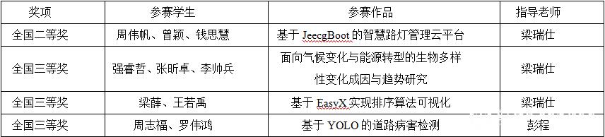 我校学生以线上答辩方式参加本次全国总决赛。在20分钟的答辩时间内,有10分钟用来展示本组项目,并将需求分析、技术路线、技术特点、项目创新、开发难点与研发总结等方面深入阐述。另外的10分钟则留给评审专家提问环节,面对国赛评审专家的专业提问,我校学子从技术特征、技术路线、市场前景等多个角度回答评委的提问,充分展现了我校学子出色的专业水平。最终,由梁瑞仕老师指导,周伟帆、曾颖、钱思慧等三位同学设计开发的作品《基于JeecgBoot的智慧路灯管理云平台》获全国二等奖,强睿哲、张昕卓、李帅兵等三位同学设计开发的作品《面向气候变化与能源转型的生物多样性变化成因与趋势研究》获全国三等奖,梁薛、王若禹两位同学设计开发的作品《基于EasyX实现排序算法可视化》获全国三等奖。由彭程老师指导,周志福、罗伟鸿两位同学设计开发的作品《基于YOLO的道路病害检测》获全国三等奖。