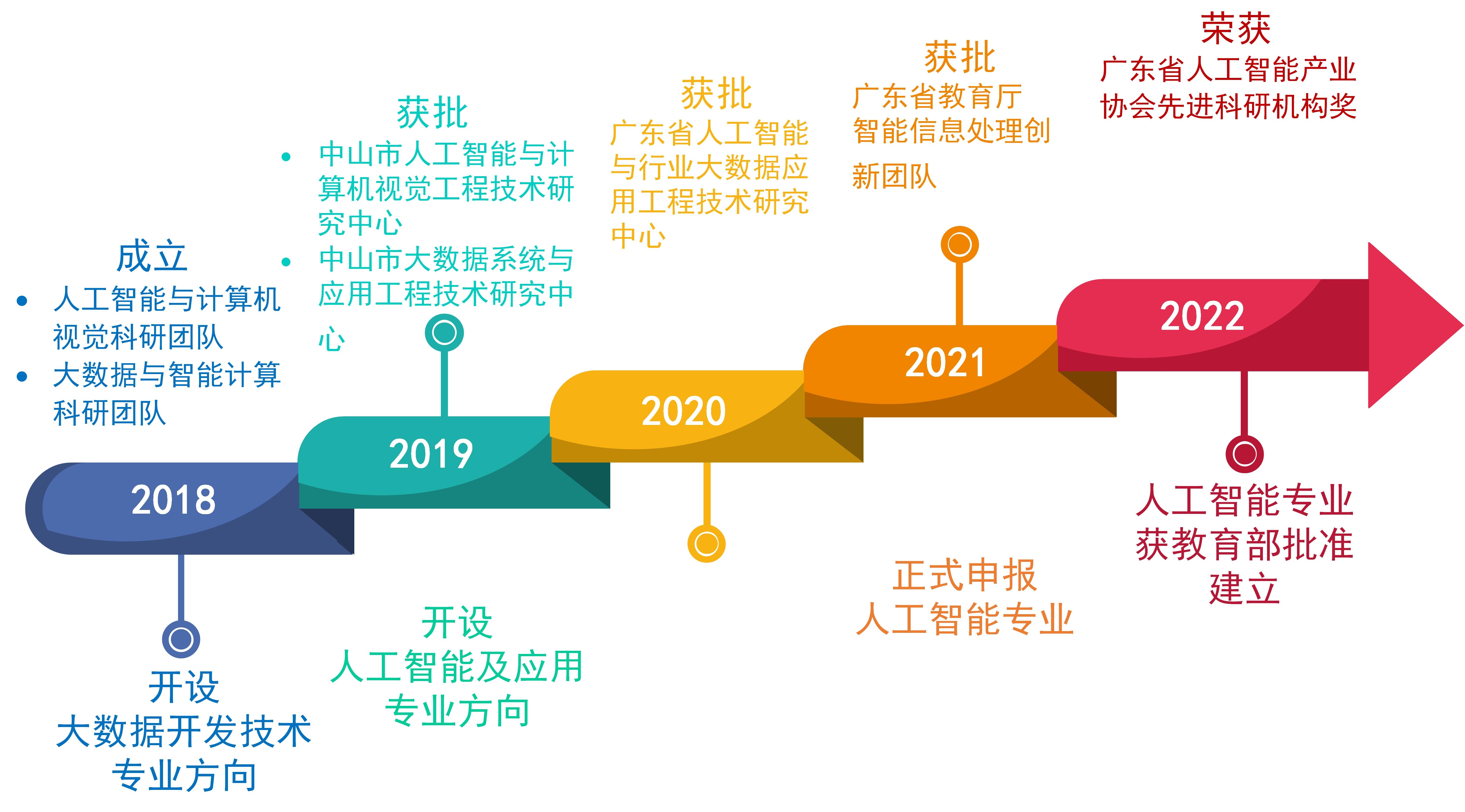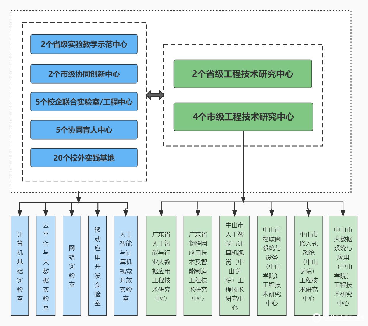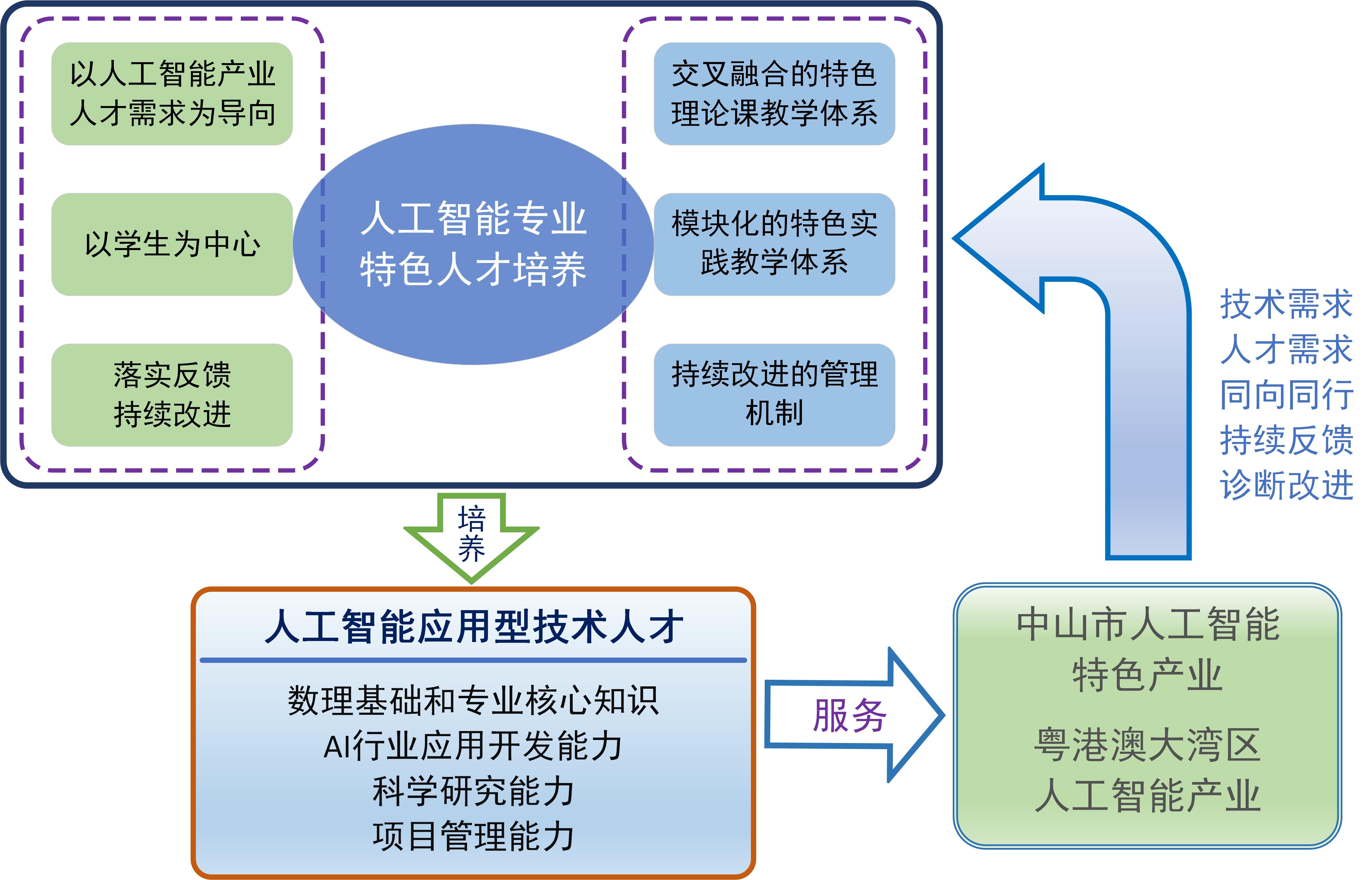 人工智能专业建设有广东省人工智能与行业大数据应用工程技术研究中心、广东省物联网应用技术及智能制造工程技术研究中心、中山市人工智能与计算机视觉工程技术研究中心、中山市大数据系统与应用工程技术研究中心,结合广东香山衡器集团股份有限公司、广东长宝信息科技股份有限公司、中数海量(中山)科技投资有限公司等20多家校外实践基地群,系统打造校企合作“5共同”+实践教育“4层次”+学生发展“4方向”的产教融合育人体系。