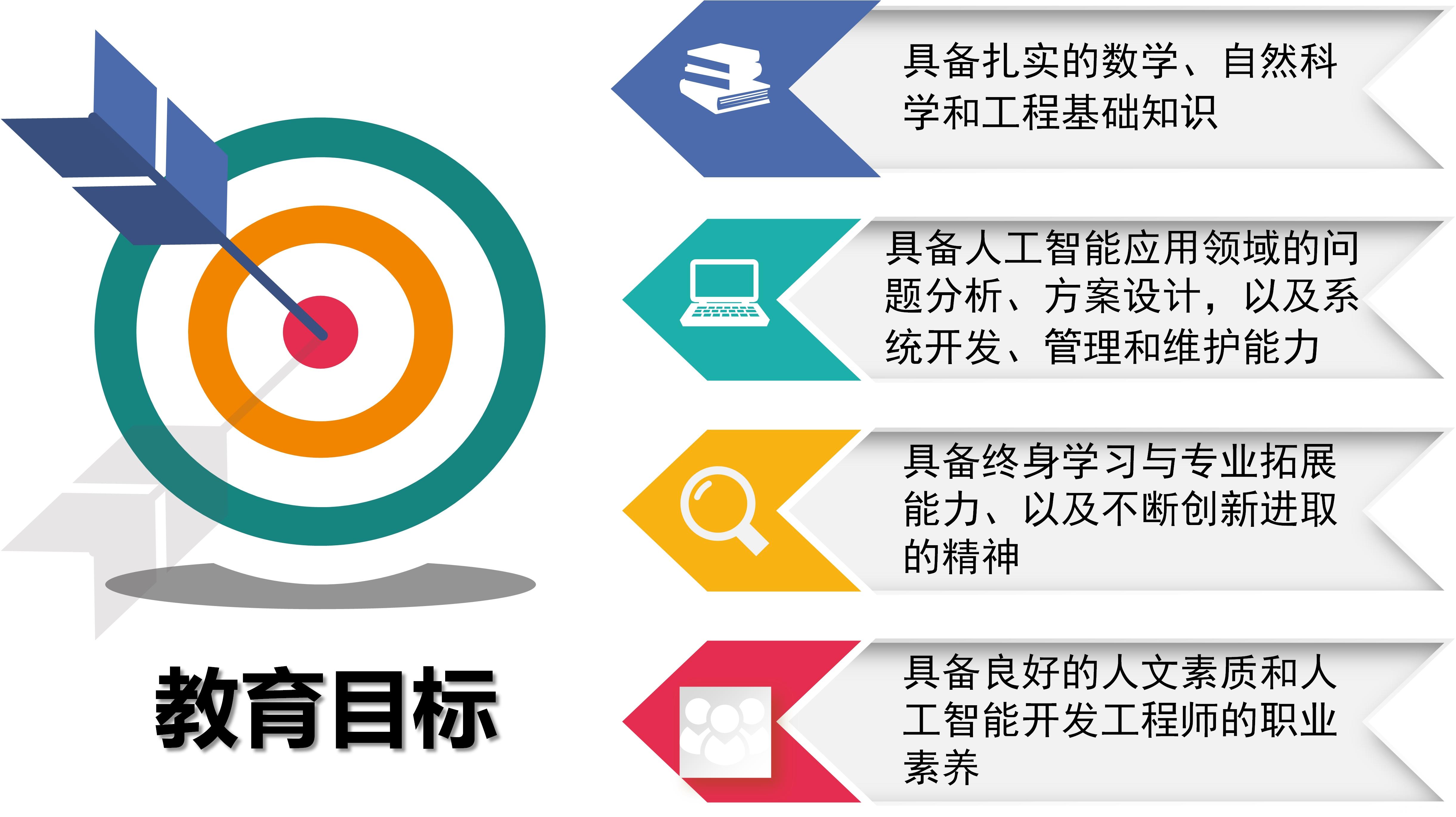 人工智能专业面向国家人工智能发展的重大战略需求,秉承“厚基础、强专业、宽领域、重应用”的理念,培养德、智、体、美、劳全面发展,具备扎实理论基础、良好人工智能素养和强大工程实践能力的高素质应用型人才。在夯实工程教育基础上,注重加强人工智能方向的应用性与创新性教育。