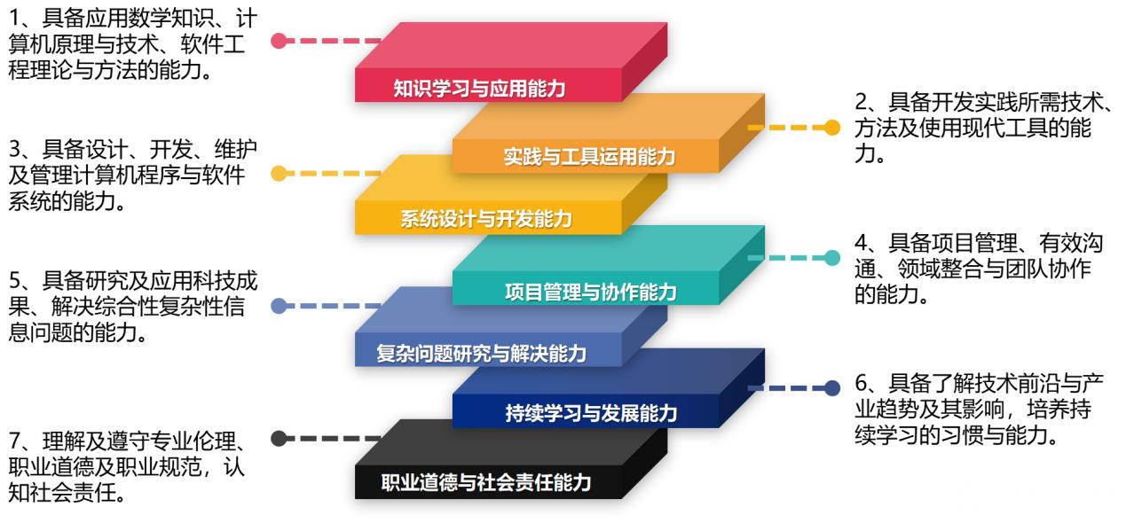 本专业要求学生掌握软件工程基本理论、基本方法和基本技术,掌握智能化的软件开发工具和环境,具有较强的系统分析、架构设计和编程能力;能够熟练运用软件工程的思想和方法,设计、开发、维护和管理中大型软件系统;具有持续学习能力、沟通能力、跨学科协作能力、技术创新能力和团队合作意识;理解并遵守职业道德和职业规范,具有良好的社会责任感。