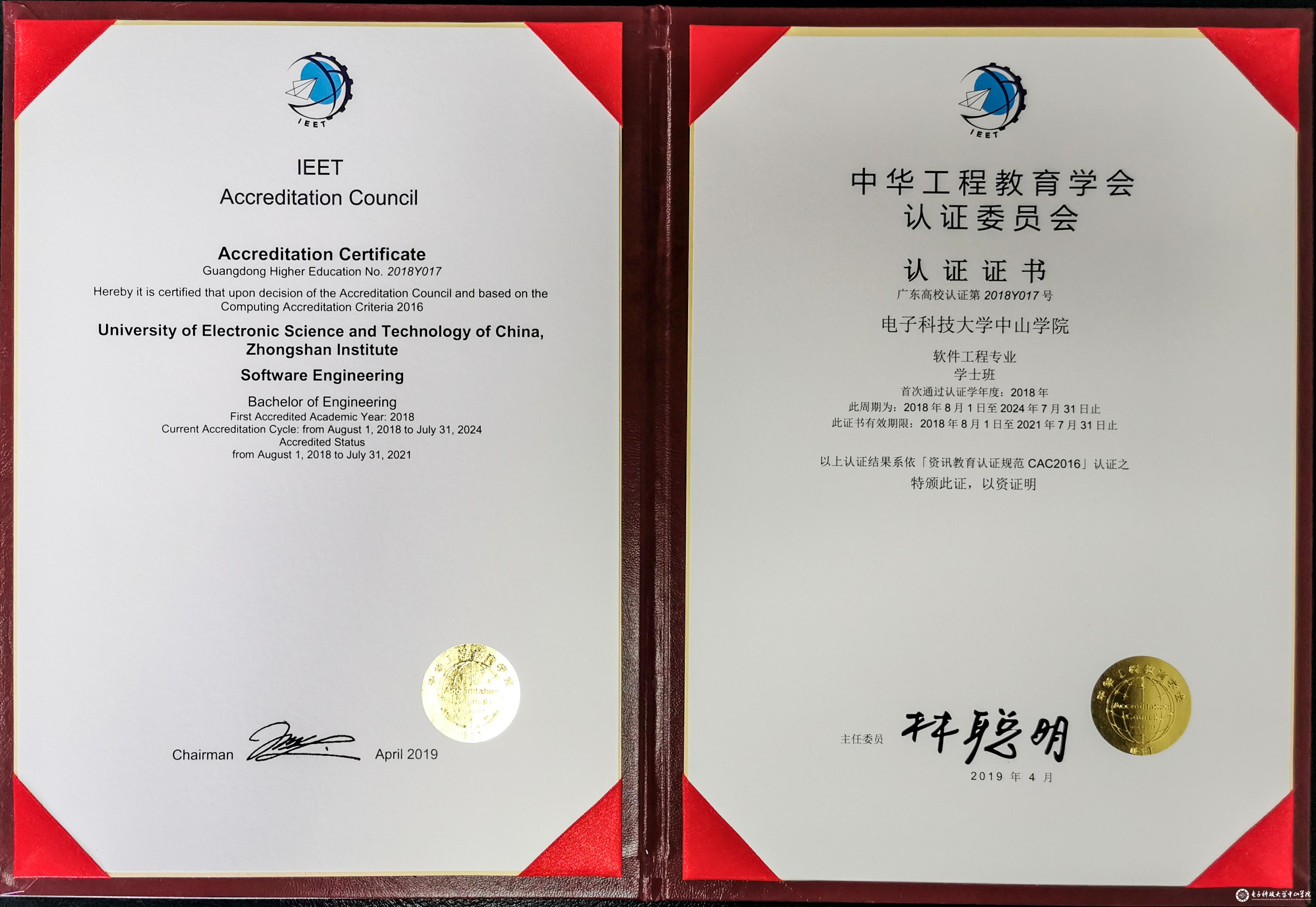 软件工程专业IEET工程教育认证证书